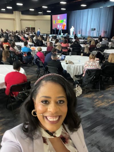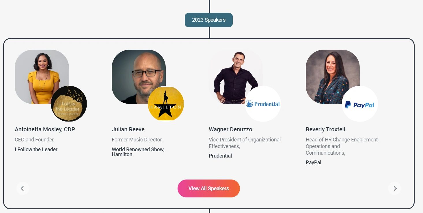 Images: The image to the left was a selfie taken after Antoinetta's keynote. Below are three images captured by a photographer during the speech. There is also a screenshot from the hr.com page featuring two keynote speakers and additional speakers.